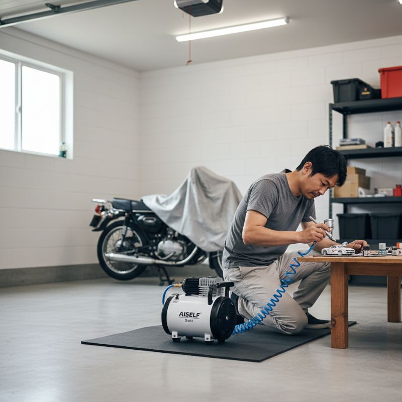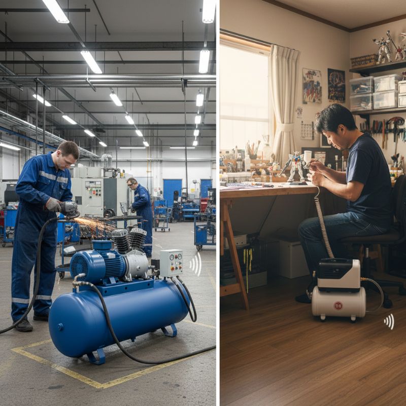 静音エアーコンプレッサーとは、運転時に発生する騒音をできるだけ抑える構造を採用したエアーコンプレッサーのことです。DIYや模型製作、エアブラシ作業など、室内や住宅密集地での使用を想定して作られています。